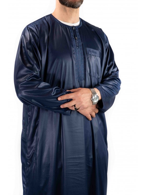 Atlas marinblå satin Qamis - långa ärmar